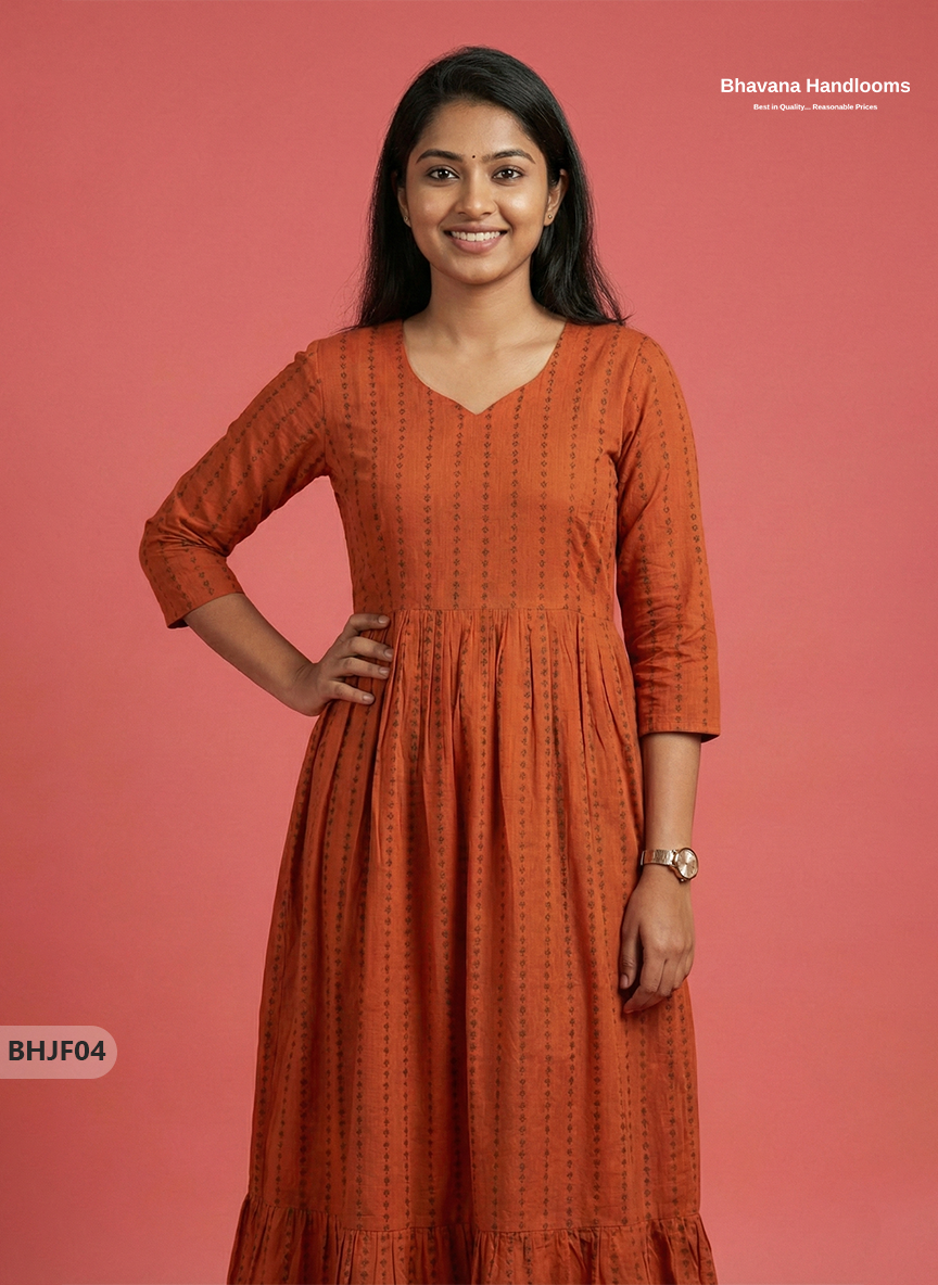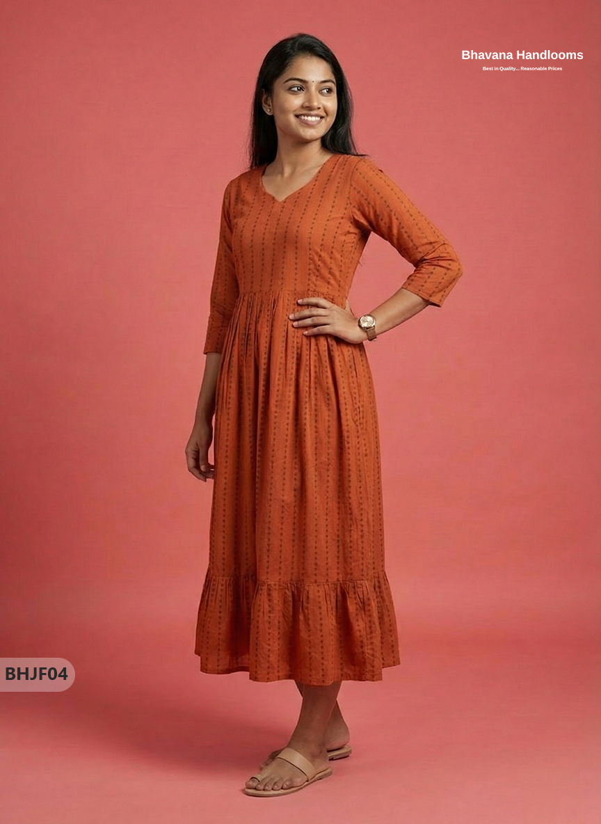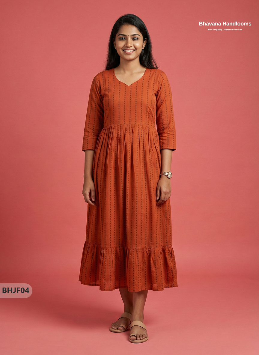 Premium Orange Jacquard Woven Frock with Full Length Lining