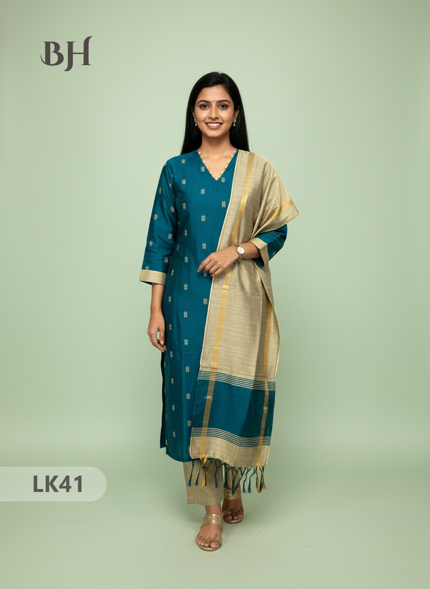 Keywords: Raw Silk Kurti Set, 3pc Kurti Set with Dupatta and Bottom, Bhavana Originals, Premium Raw Silk Dress, Full-Length Lined Kurti Set.