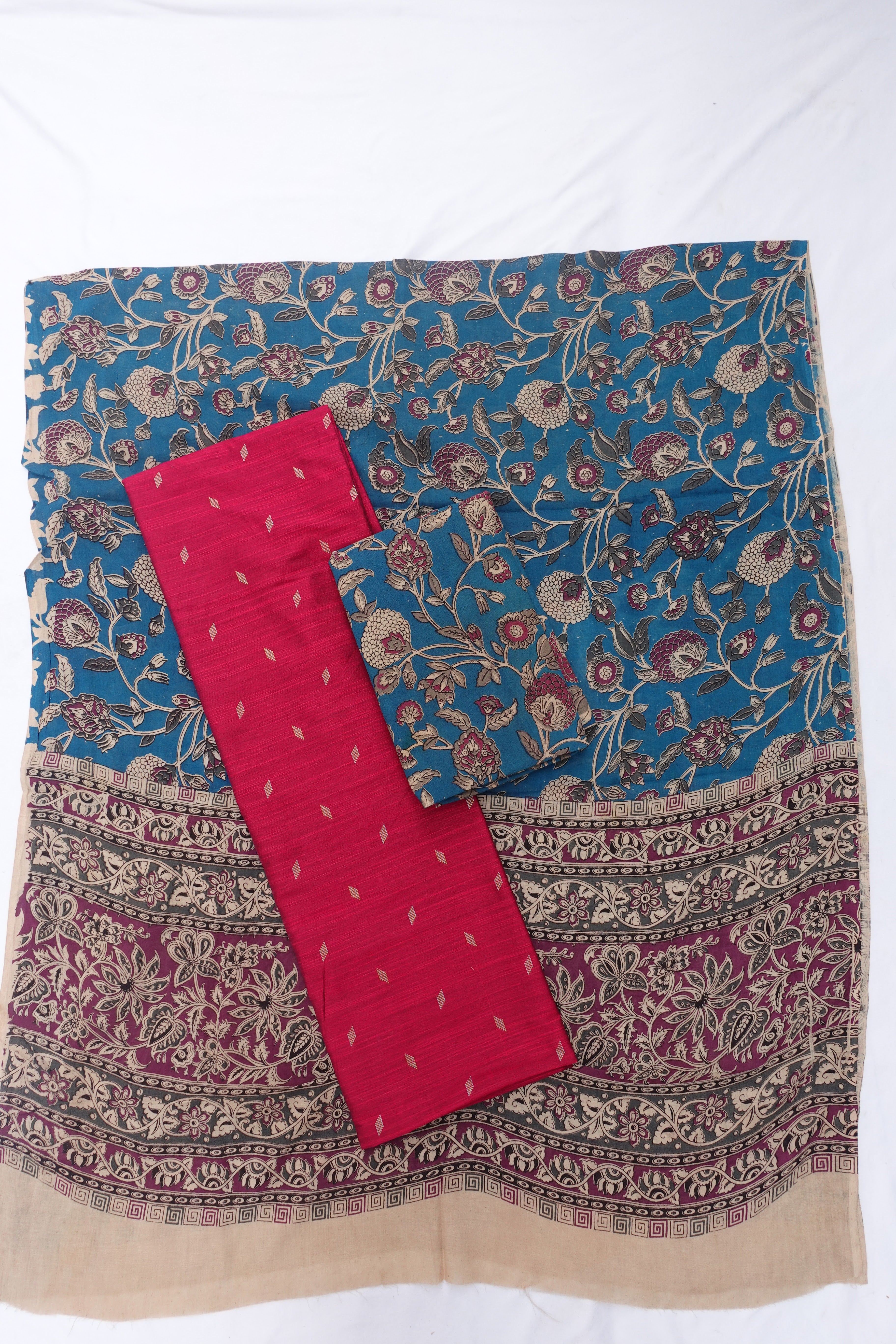 Raw Silk Dress Material with Blue Colour Kalmkari Dupatta & Blue Colour Bottom