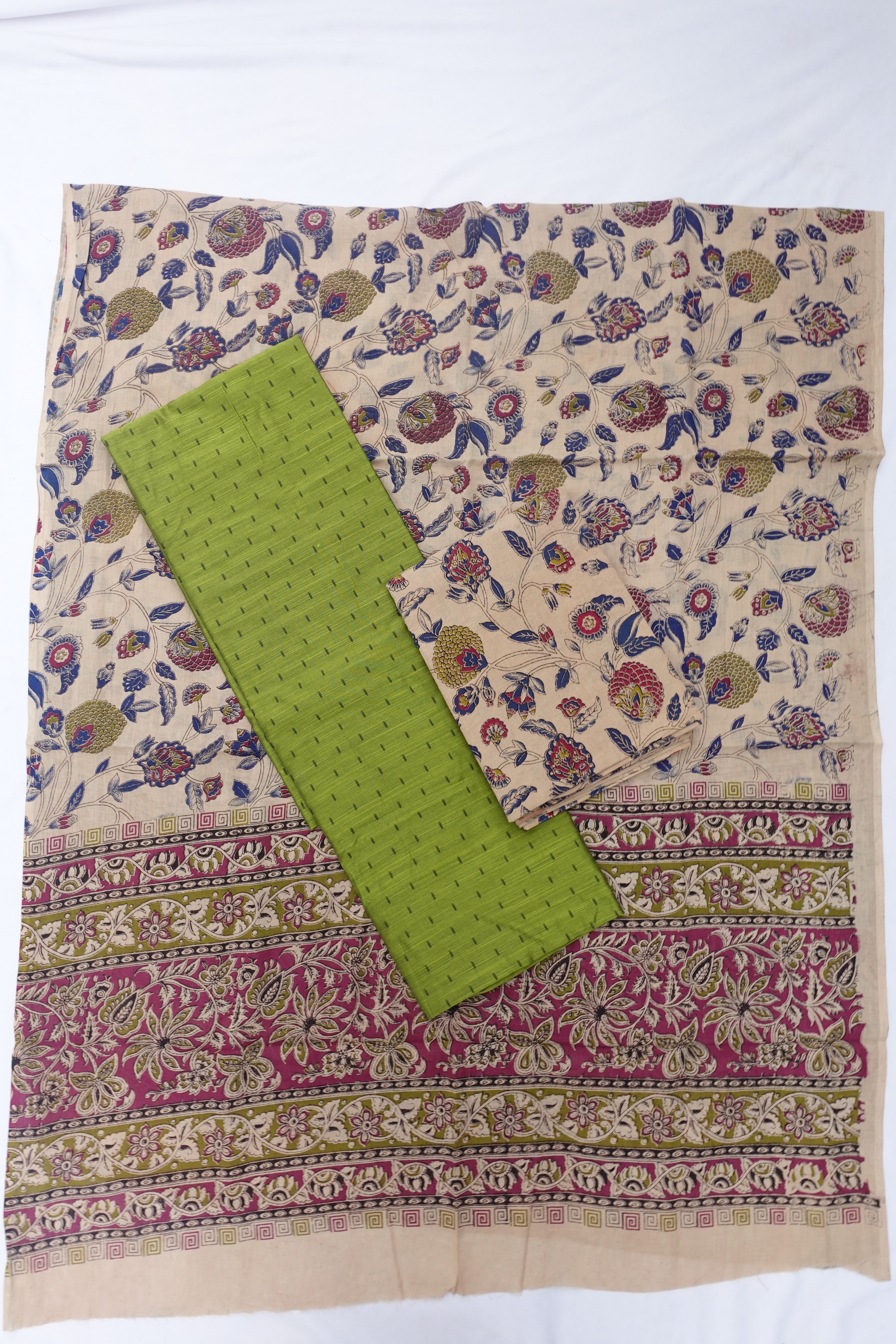 Raw Silk Dress Material with Skin Colour Kalmkari Dupatta & Skin Colour Bottom