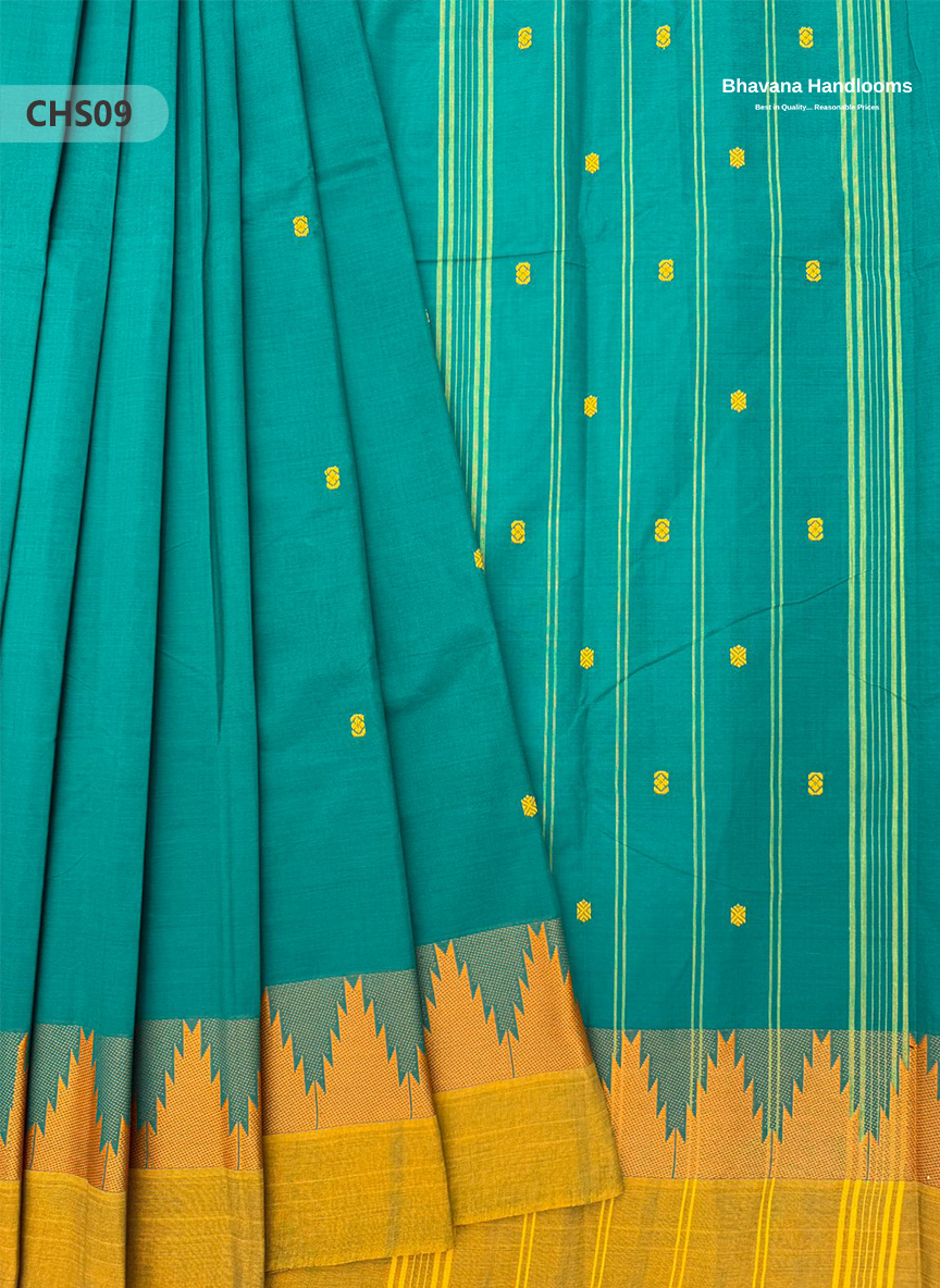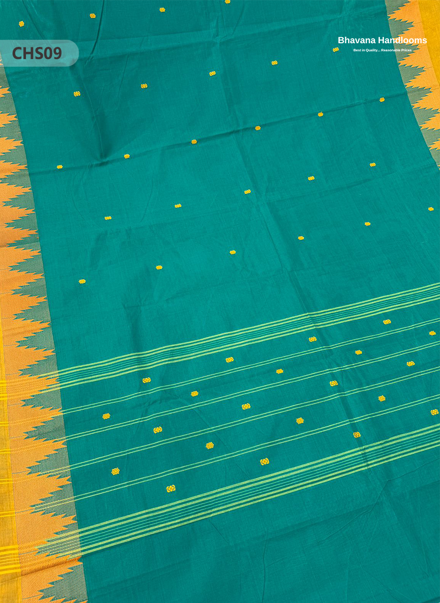 Traditional Chettinad Handloom Saree in Dark Cyan with Temple Border & Buti Weave